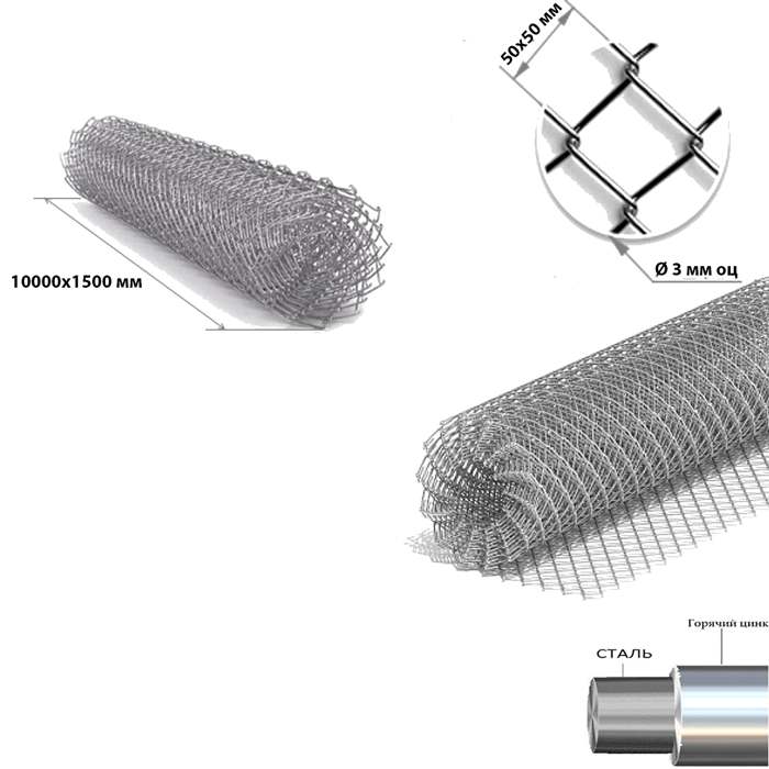 Сетка Рабица оцинкованная 10000x1500,50x50 Оц., диаметр Ø 3