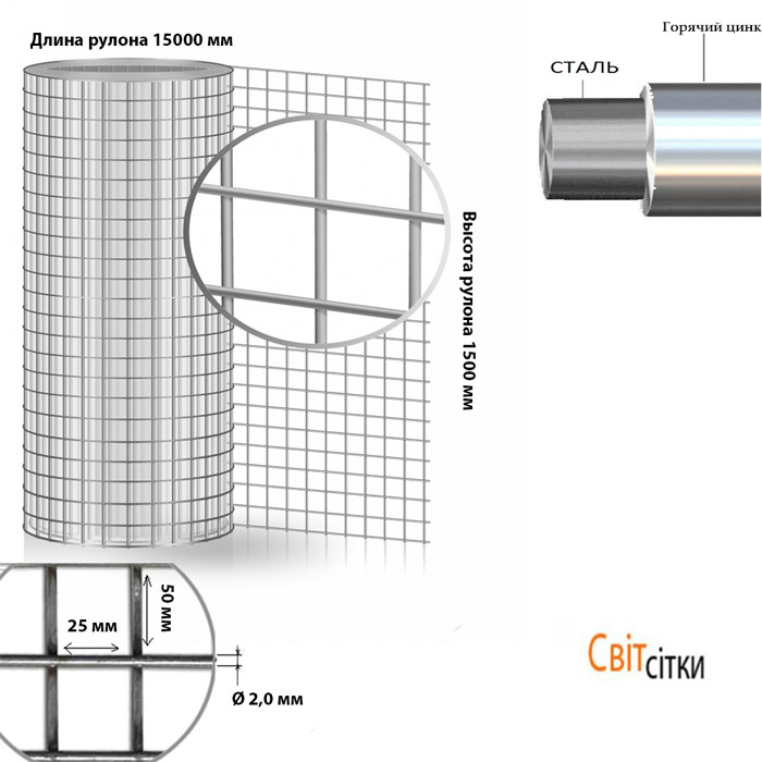 Сетка сварная в рулоне 15000x1500, размер 50x25 оцинкованная, диаметр Ø 2,0 мм.