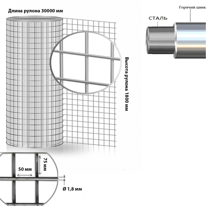 Сетка сварная в рулоне 30000x1800, размер 75x50 оцинкованная, диаметр Ø 1,8 мм.