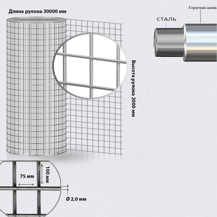 Сетка сварная в рулоне 30000x2000, размер 100х75 оцинкованная, диаметр Ø 2,0 мм.